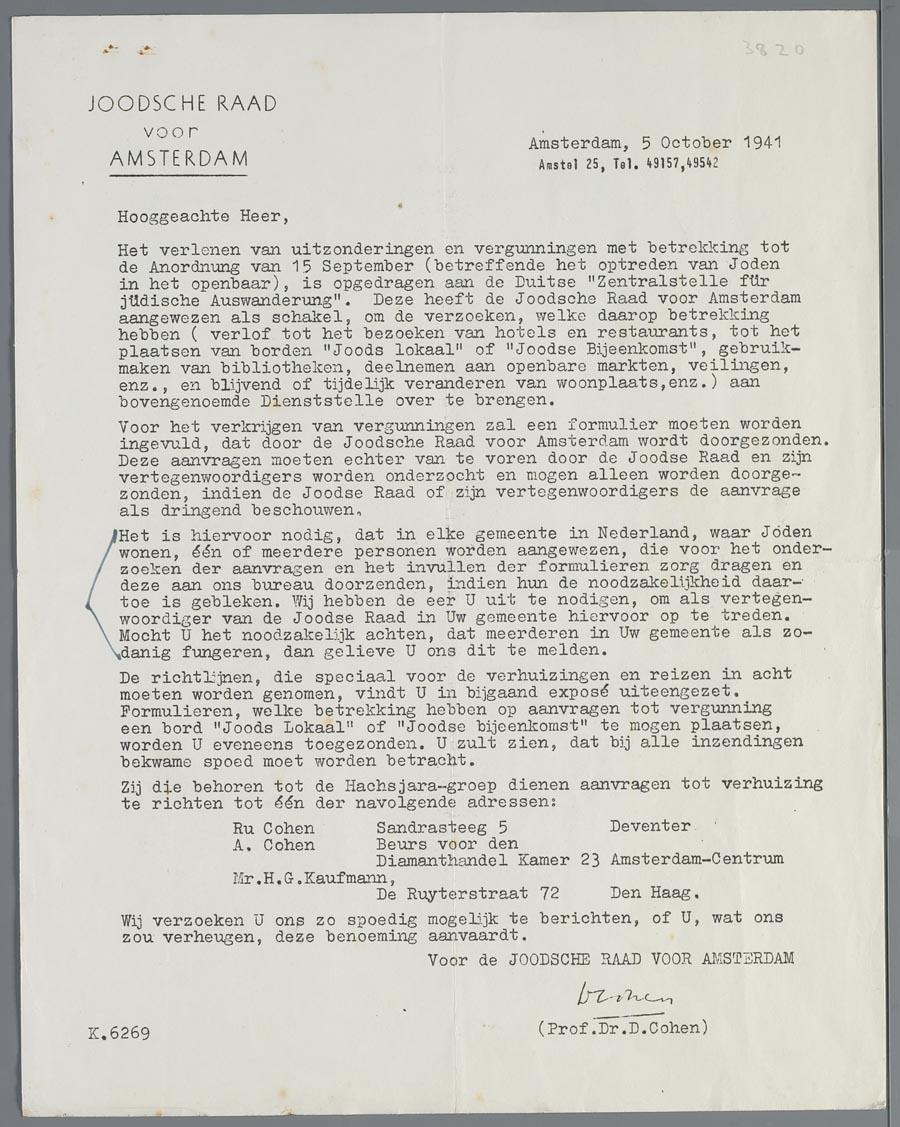 Circulaire van de Joodse Raad m.b.t. aanvragen voor de borden "Joods Lokaal" en "Joodse Bijeenkomst", oktober 1941