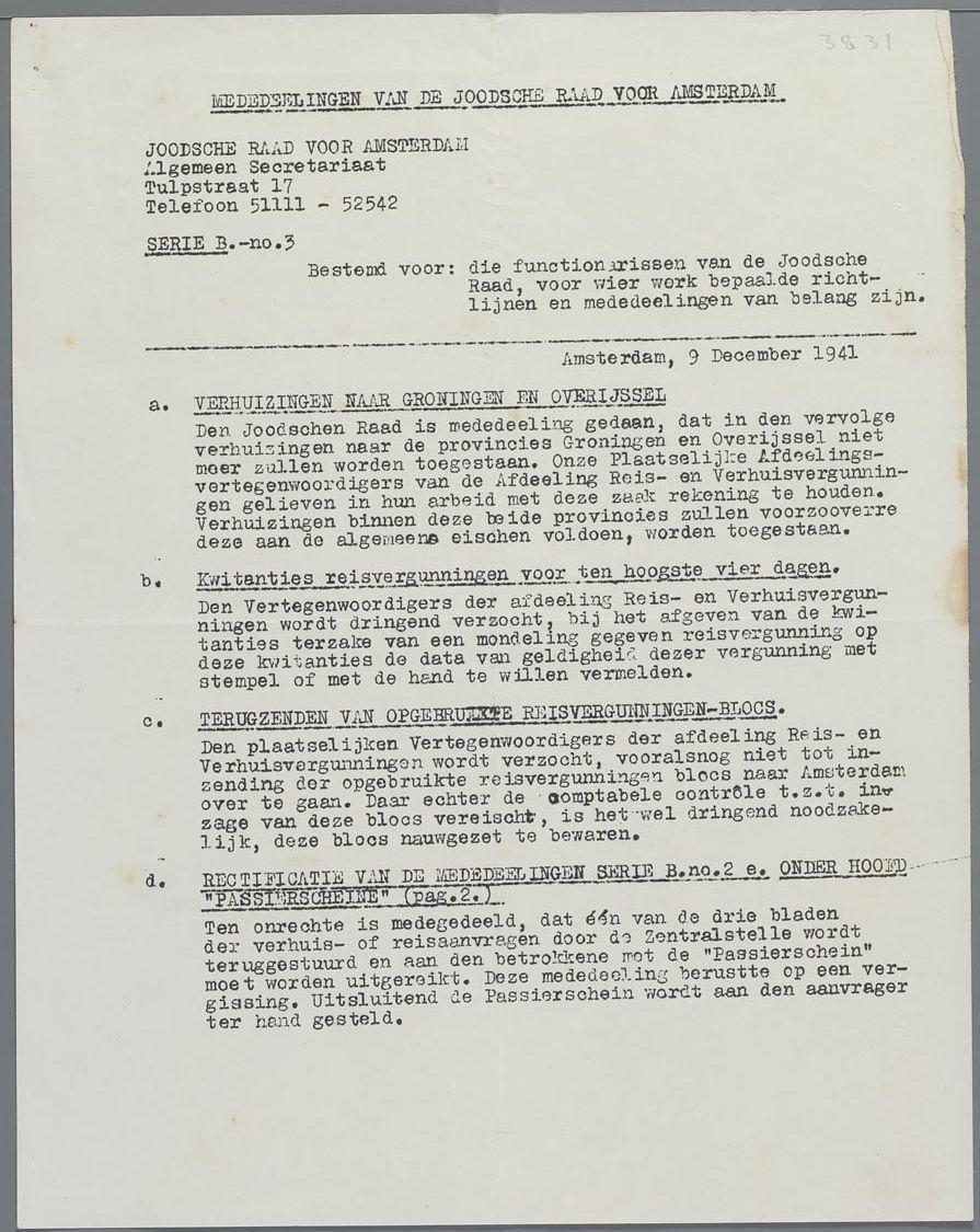Interne circulaire van de Joodse Raad m.b.t. verhuis- en reisvergunningen, december 1941