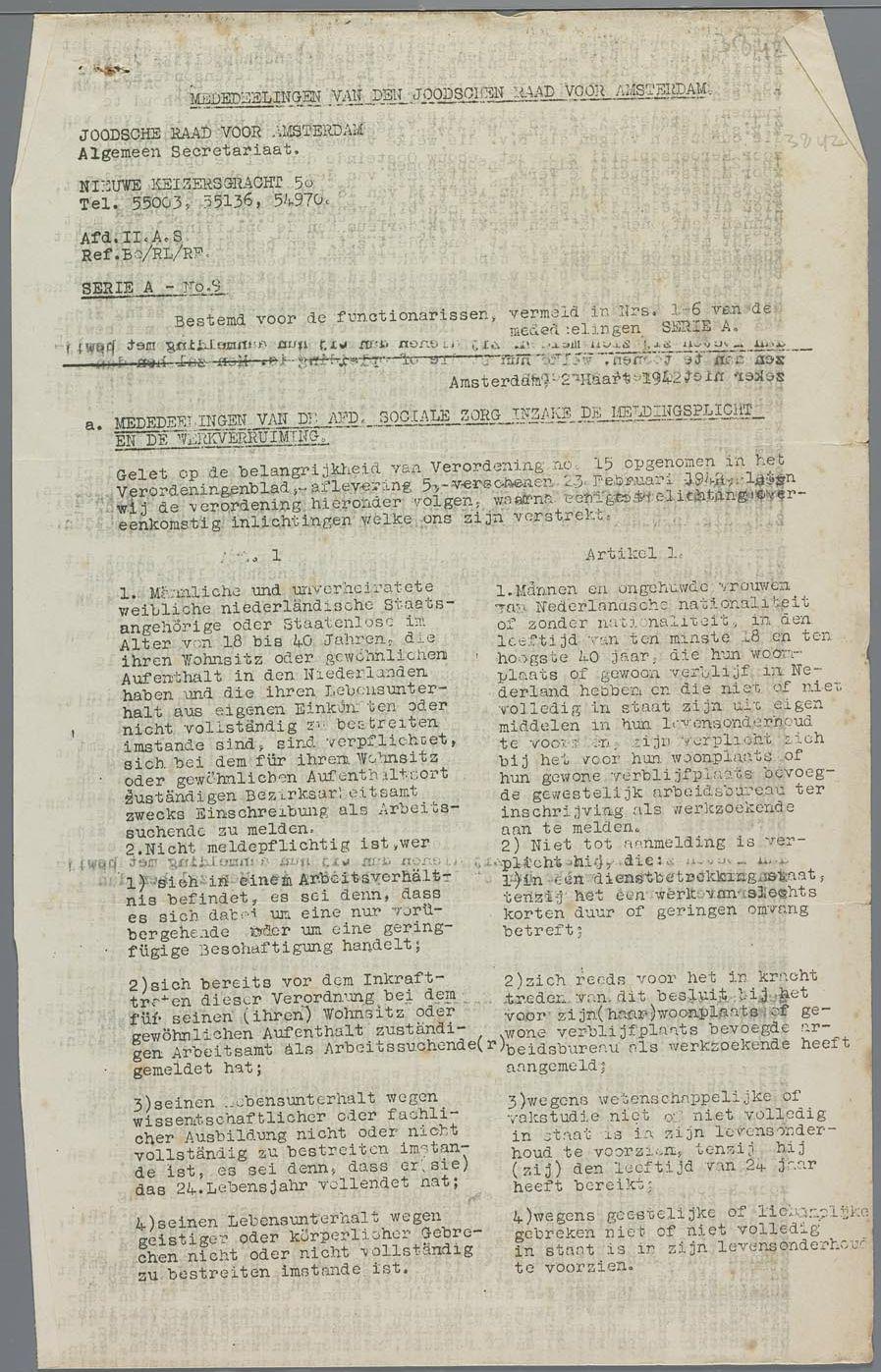 Circulaire van de Joodse Raad m.b.t. aanmeldingsplicht, arbeidsbemiddeling, maart 1942