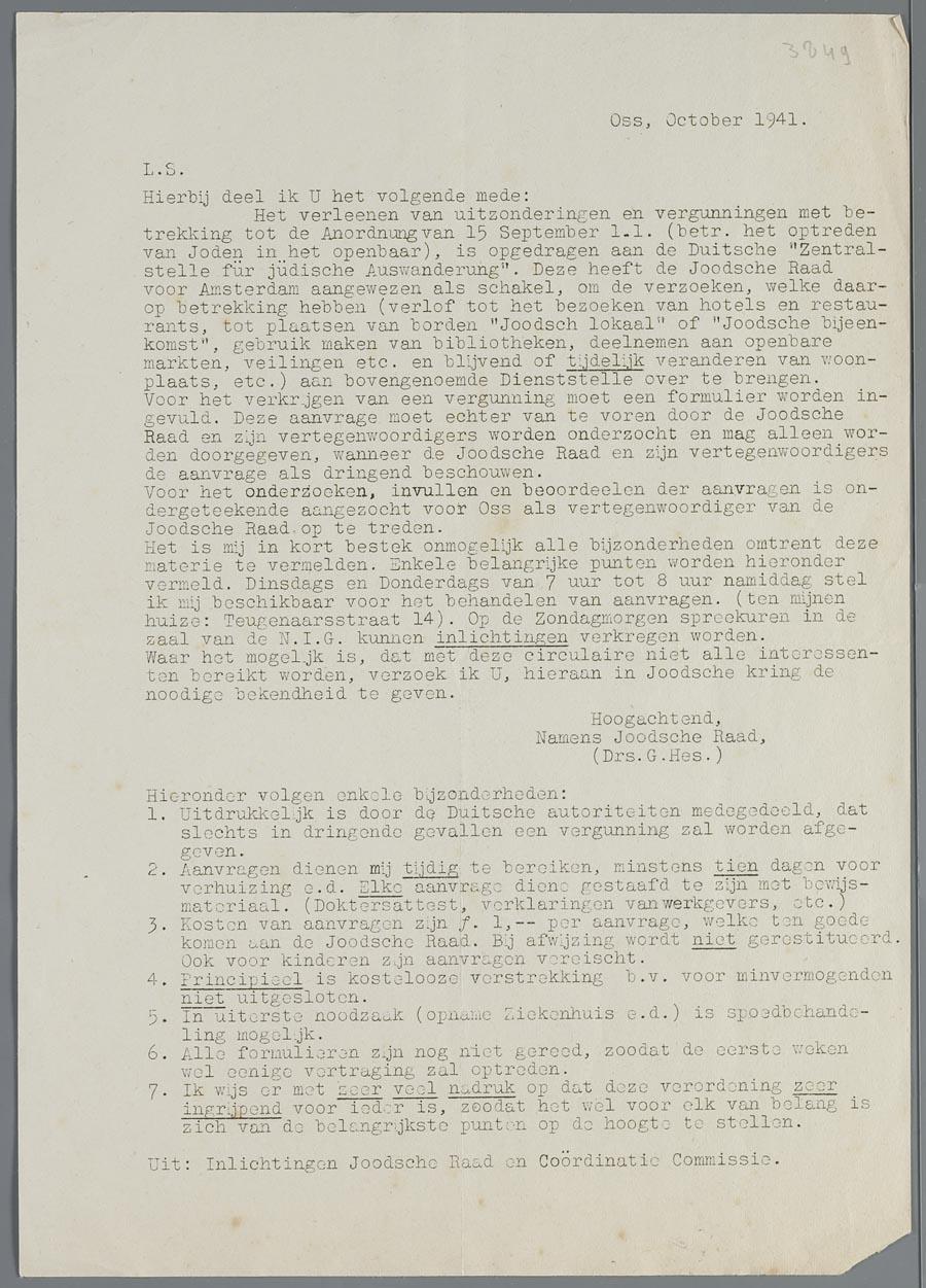 Circulaire van de Joodse Raad afdeling Oss m.b.t. de regelingen omtrent het aanbrengen van borden "Joods Lokaal" of "Joodse bijeenkomst", oktober 1941