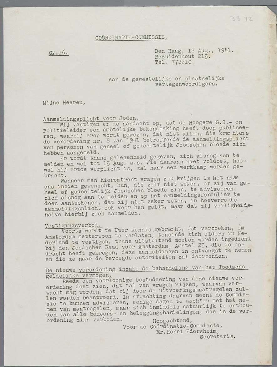 Circulaire van de Joodse Coordinatie Commissie, onder meer over de aanmeldingsplicht voor joden, augustus 1941
