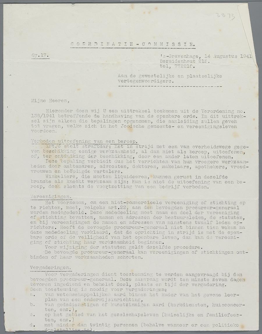 Circulaire van de Joodse Coordinatie Commissie o.a. over beroepsverboden, verenigingen, vergaderingen, openbare inzamelingen en verkeersbeperkingen voor joden, augustus 1941