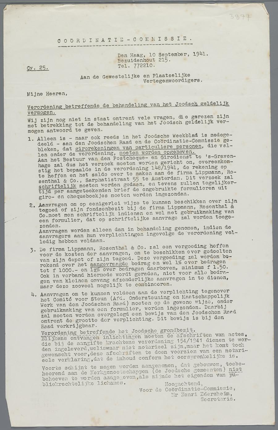 Circulaire van de Joodse Coordinatie Commissie over de (vele vragen over) de regelingen aangaande het 'joodsch geldelijk vermogen', september 1941