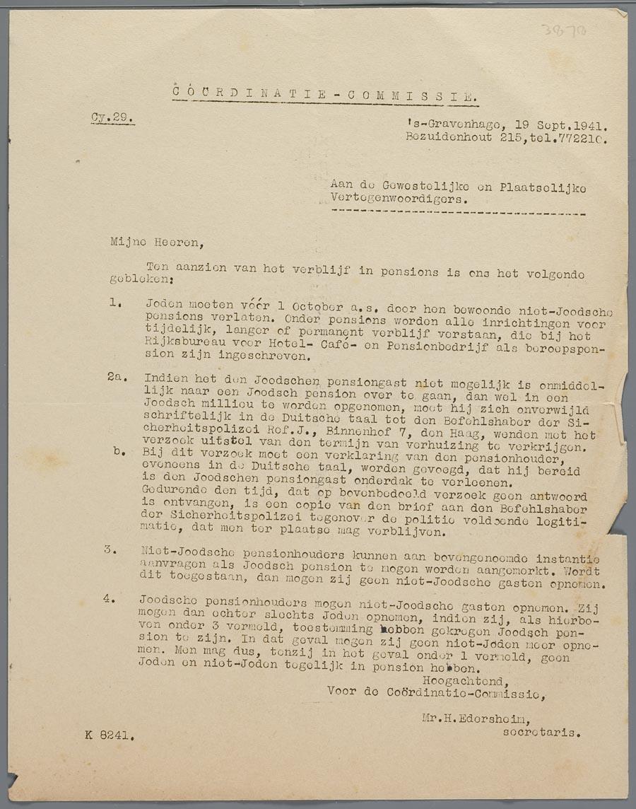 Circulaires (2) van de Joodse Coordinatie Commissie m.b.t. joodse pensiongasten en slagers, september 1941