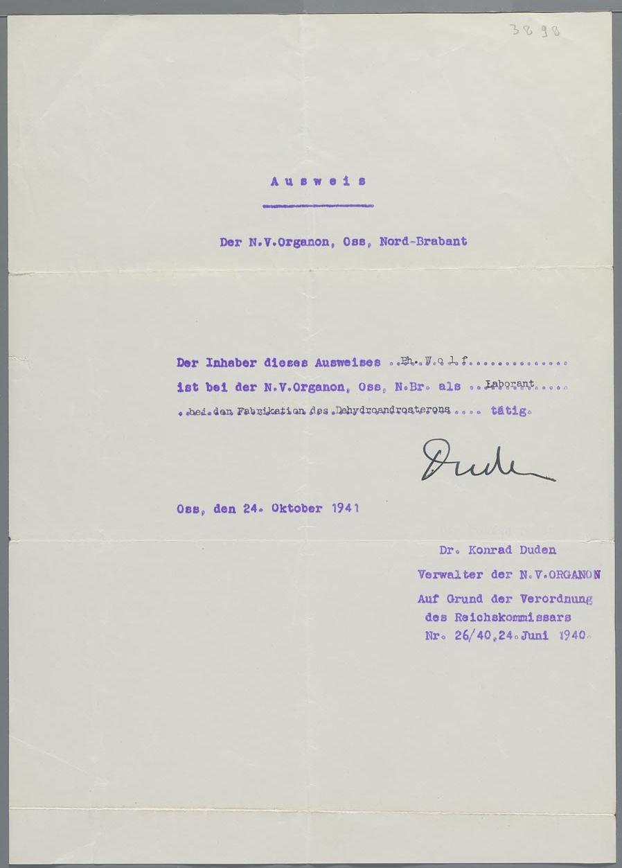 Verklaring van N.V. Organon ten aanzien van werkzaamheden van laborant Philip Wolf, 24 oktober 1941