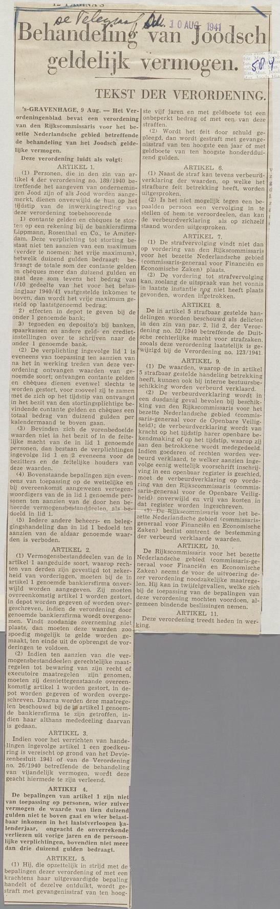 Krantenknipsels (7) betreffende de behandeling van joodse geldelijk vermogen, augustus 1941