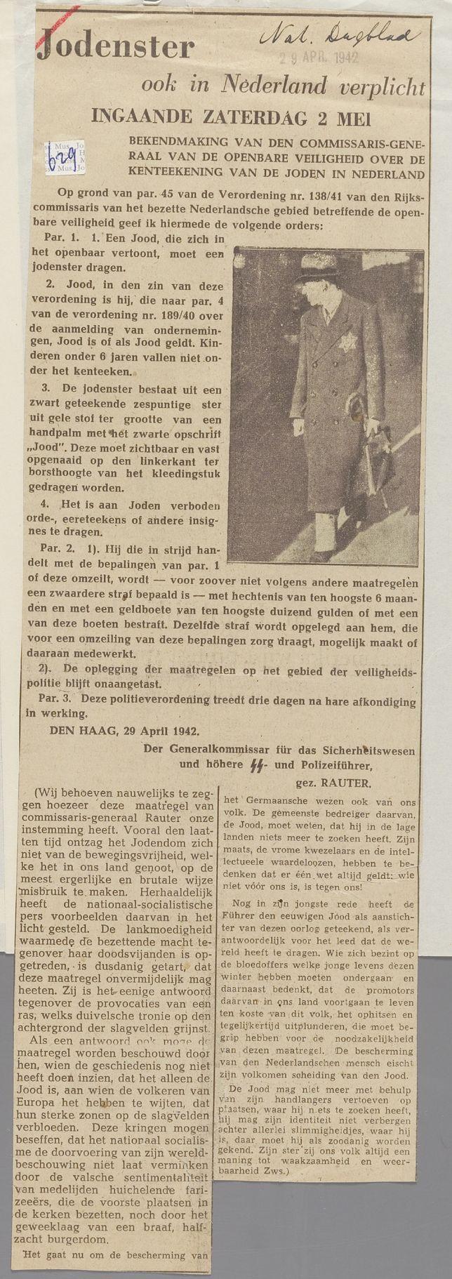 Krantenknipsel uit het Nationale Dagblad waarin de verplichting tot het dragen van de jodenster wordt toegejuicht, april 1942