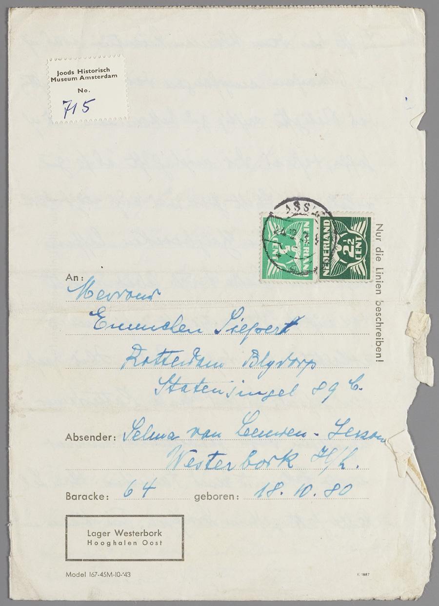 Brief van Selma van Leeuwen-Gerzon aan mevr. Emmchen Siepert, met diverse mededelingen uit kamp Westerbork, 1943