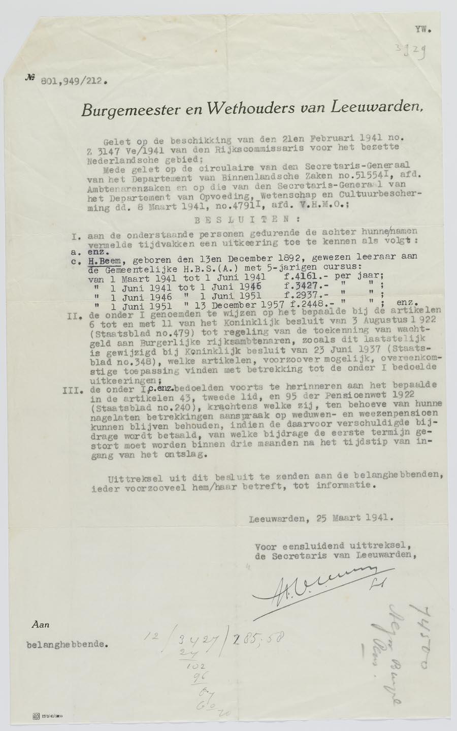 Mededeling aan Hartog Beem m.b.t. uitkering na zijn ontslag als onderwijzer aan de Gemeentelijke H.B.S. in Leeuwarden, maart 1941