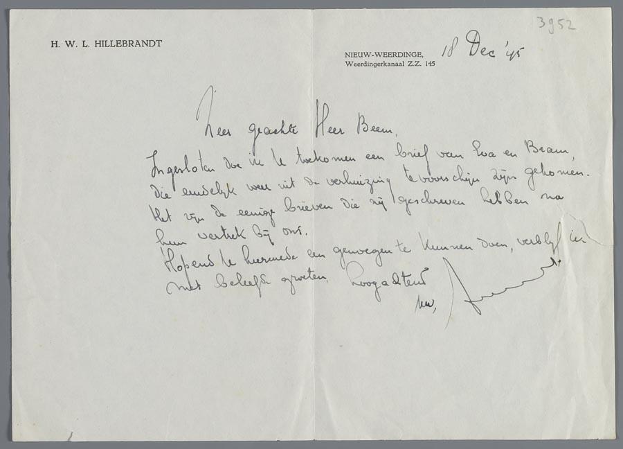 Brief van H. Hillebrandt in Ermelo aan Hartog Beem, waarin twee brieven van Bram en Eva Beem ter sprake komen, december 1945