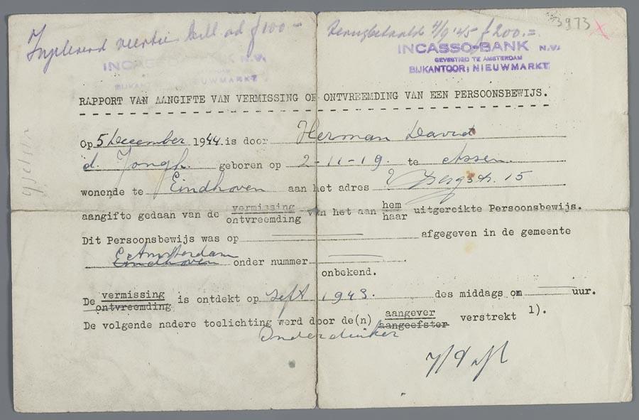 Rapport van aangifte van vermissing van een persoonsbewijs t.n.v. H. de Jongh, 1944