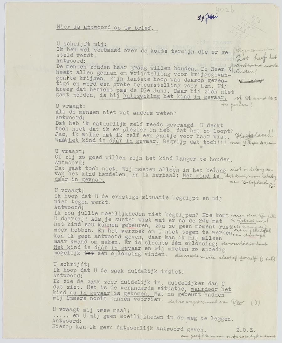 Brief aan J. (=J. Ringer(?)) m.b.t. onderduikprobleem, 1942