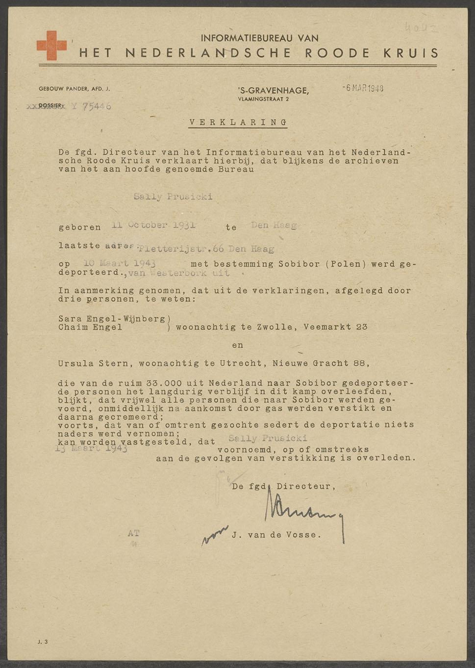 Verklaring v/h Ned. Rode Kruis m.b.t. overlijden S. Prusicki te Sobibor (1943), 1948