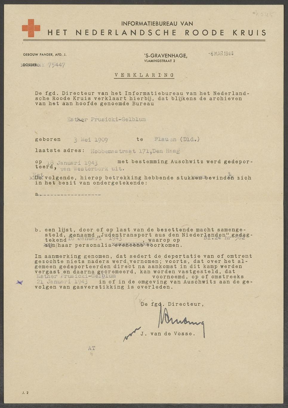 Verklaring van het Ned. Rode Kruis m.b.t. overlijden E. Prusicki- Geldblum te Auschwitz (1943), 1948