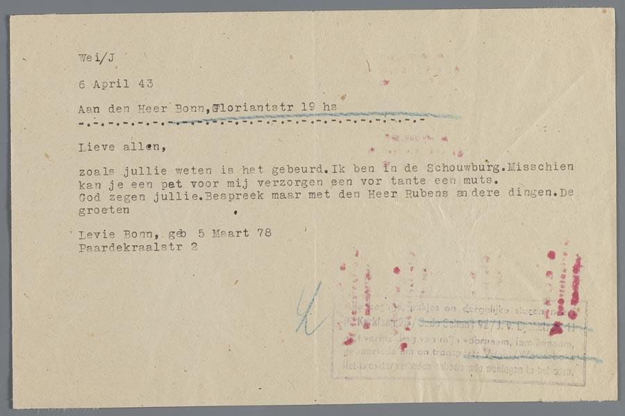 Telegram van Levie Bonn uit de Hollandsche Schouwburg aan Samson Bonn en familie, april 1943