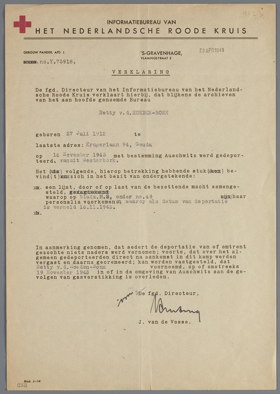 Verklaring van het Rode Kruis met betrekking tot het overlijden van Betty van der Hoeden-Bonn in 1943, d.d. 20 april 1948