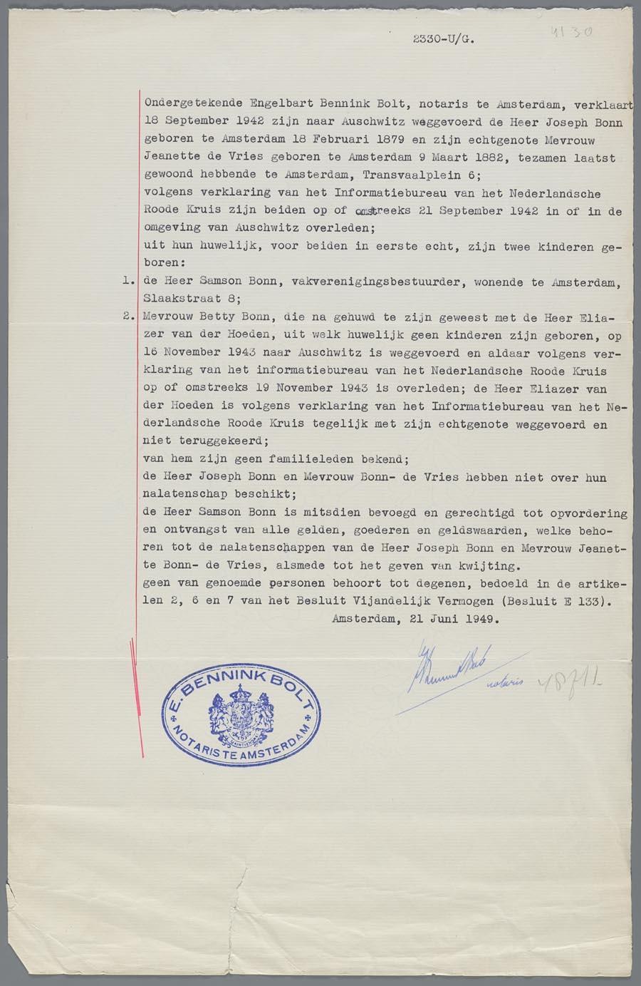 Een verklaring van notaris E. Bennink Bolt met betrekking tot het overlijden van Joseph Bonn en Jeanette Bonn-de Vries en hun dochter Betty van der Hoeden-Bonn, d.d. 1949