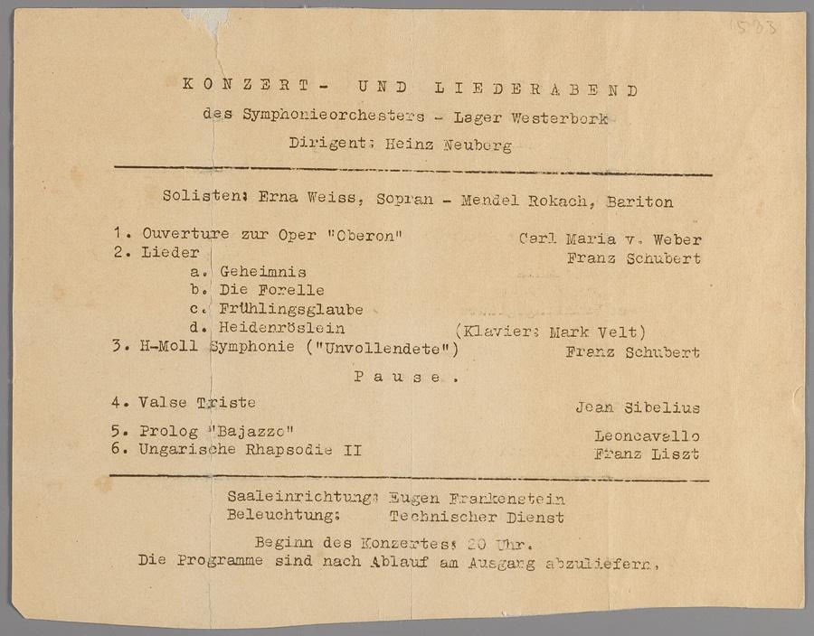 Programma van concert en liederenavond in Westerbork door het symfonieorkest van Westerbork, onder leiding van Heinz Neuburg, circa mei 1943