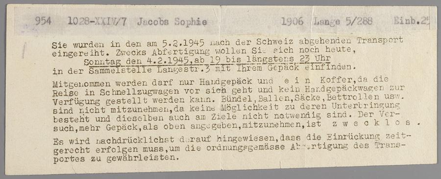 Oproep voor transport naar Zwitserland, op naam van Sophie Adèle Jacobs, Theresienstadt, 1945