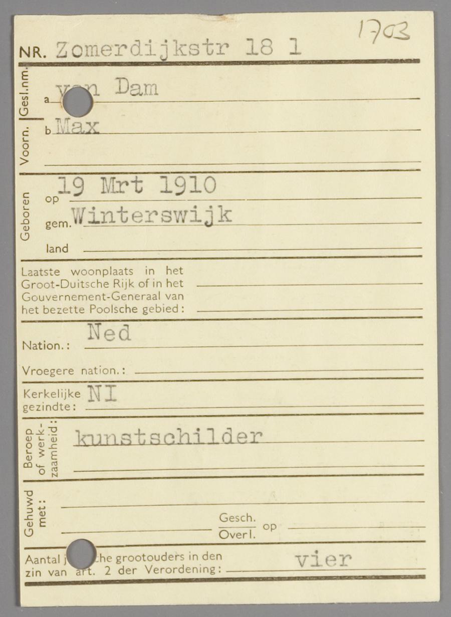 Aanmeldingsbewijs voor 'personen van geheel of gedeeltelijk joodschen bloede', op naam van Max van Dam, 1941