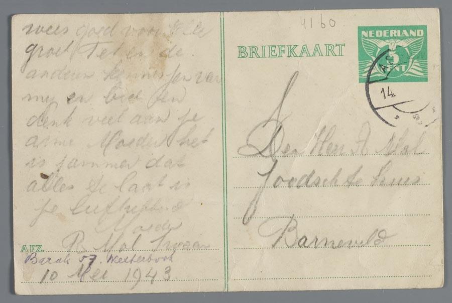 Briefkaart van Roosje Mol-Swaan in kamp Westerbork aan haar zoon Abraham (Bram) Mol in kamp Barneveld, mei 1943