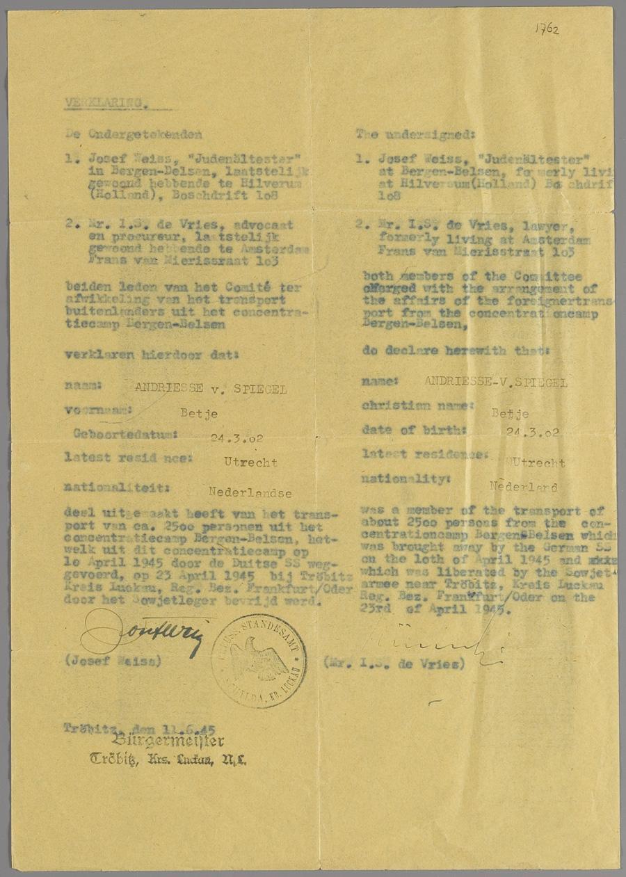 Verklaring van Josef Weiss en I.S. de Vries, lid van het "Comité ter Afwikkeling van het Transport Buitenlanders uit het Concentratiekamp Bergen-Belsen"over de bevrijding van Betje Andriesse-van Spiegel, bij Tröbitz, juni 1945