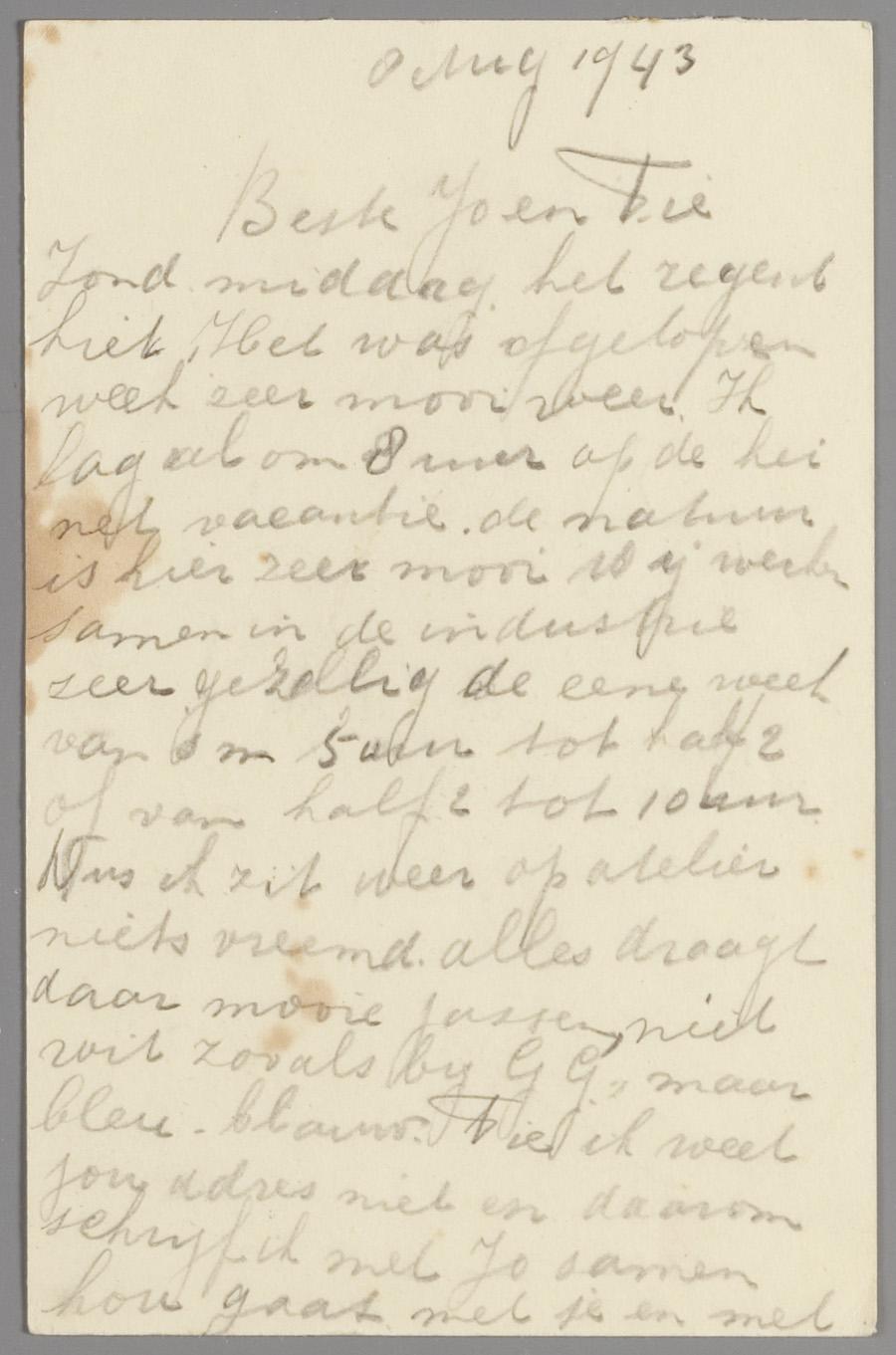 Briefkaarten (3) en brief van Lien en Leo Hauptmann in Westerbork aan haar vriendinnen Jo Hanekamp en Fie (zonder achternaam) in Amsterdam, 1942-1943