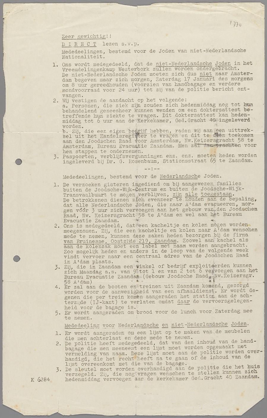 Mededeling bestemd voor Joden van niet-nederlandse nationaliteit voor vertrek uit Zaandam, 1941/42