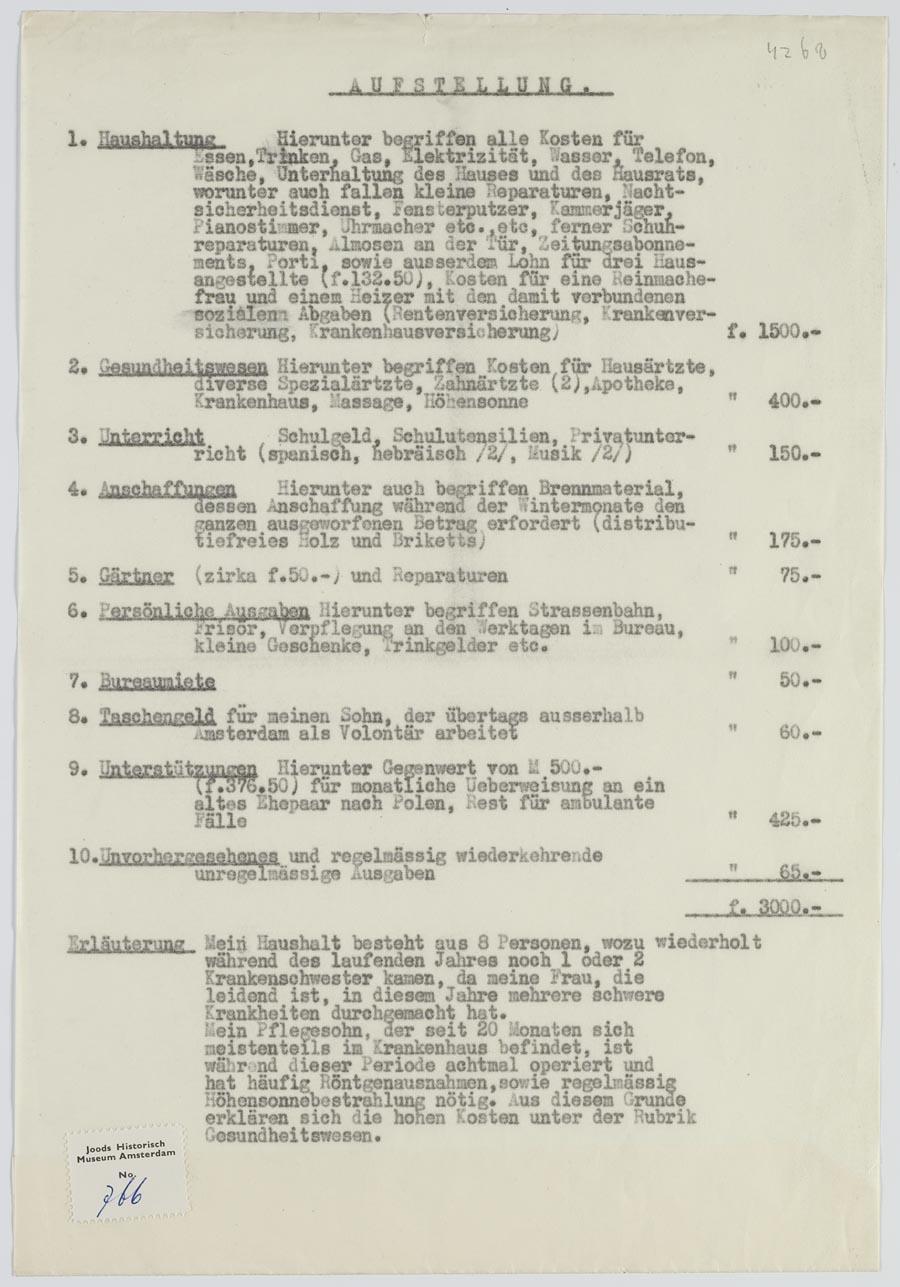 Opgave van de maandlasten van een onbekend gezin (van acht personen) met veel ziektekosten. Dergelijke opgaven moesten worden gemaakt om geld te mogen opnemen van het door Liro beheerde 'joodse vermogen', van de eigen bankrekening dus.