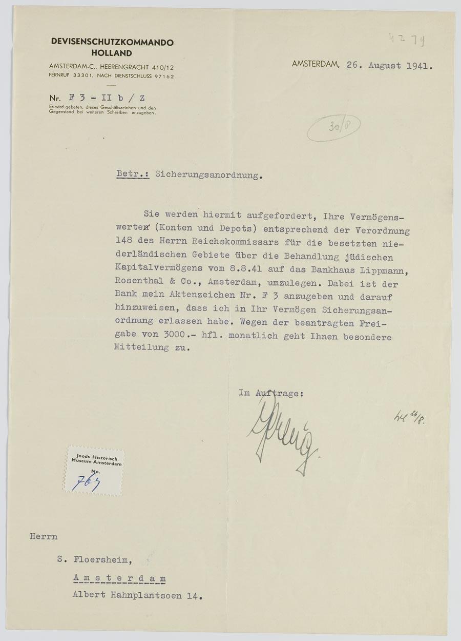 Brief van Devisenschutzkommando aan Salomon Jacob Flörsheim, augustus 1941