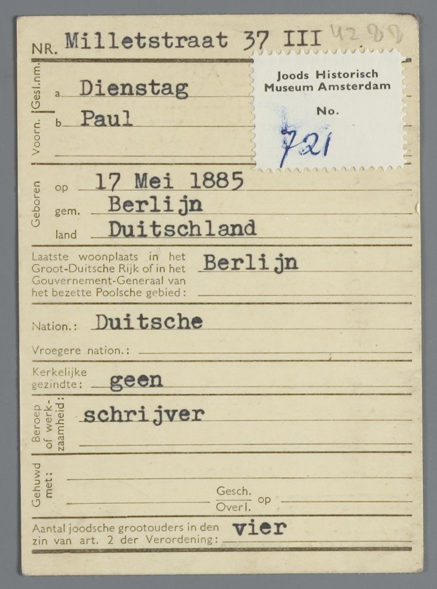 Aanmeldingsbewijs voor 'personen van geheel of gedeeltelijk joodschen bloede', op naam van Paul Dienstag, 1941