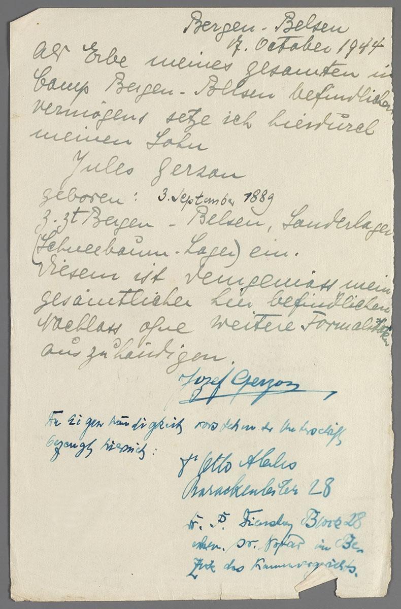 Testament van Jozef Gerzon in Bergen-Belsen, die zijn bezittingen nalaat aan zijn zoon Jules Gerzon, oktober 1944