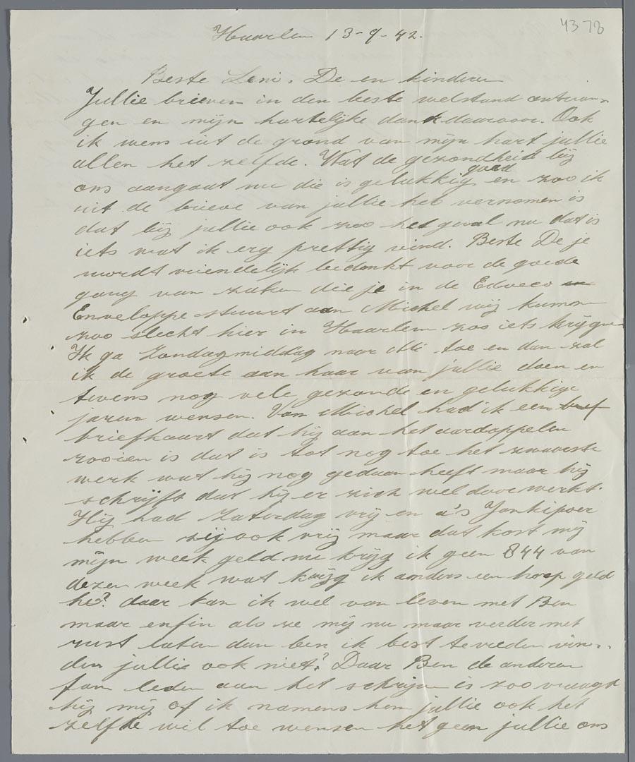 Brief van Betje de Vries-Italiaander in Haarlem aan de familie David de Vries in Amsterdam, september 1942