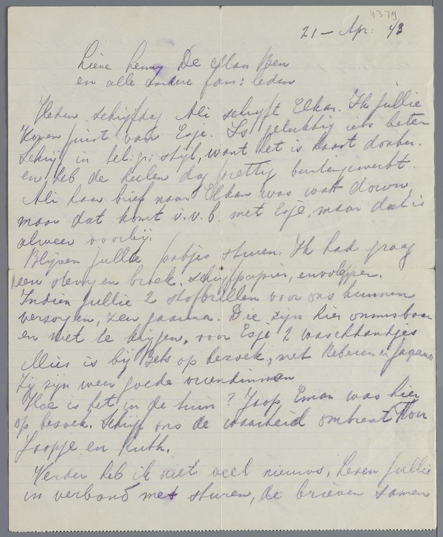 Brief van Alida de Vries-Abas uit Westerbork over het leven in het kamp en de gezinsleden aan haar broer David de Vries, april 1943