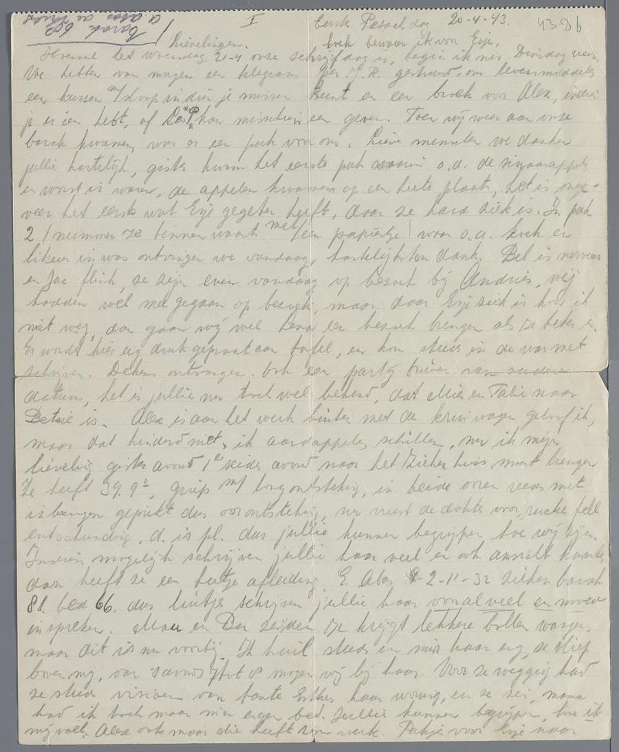 Brief uit Westerbork van Alida Abas-de Vries aan haar broer en familie, de familie David de Vries in Amsterdam, 1943
