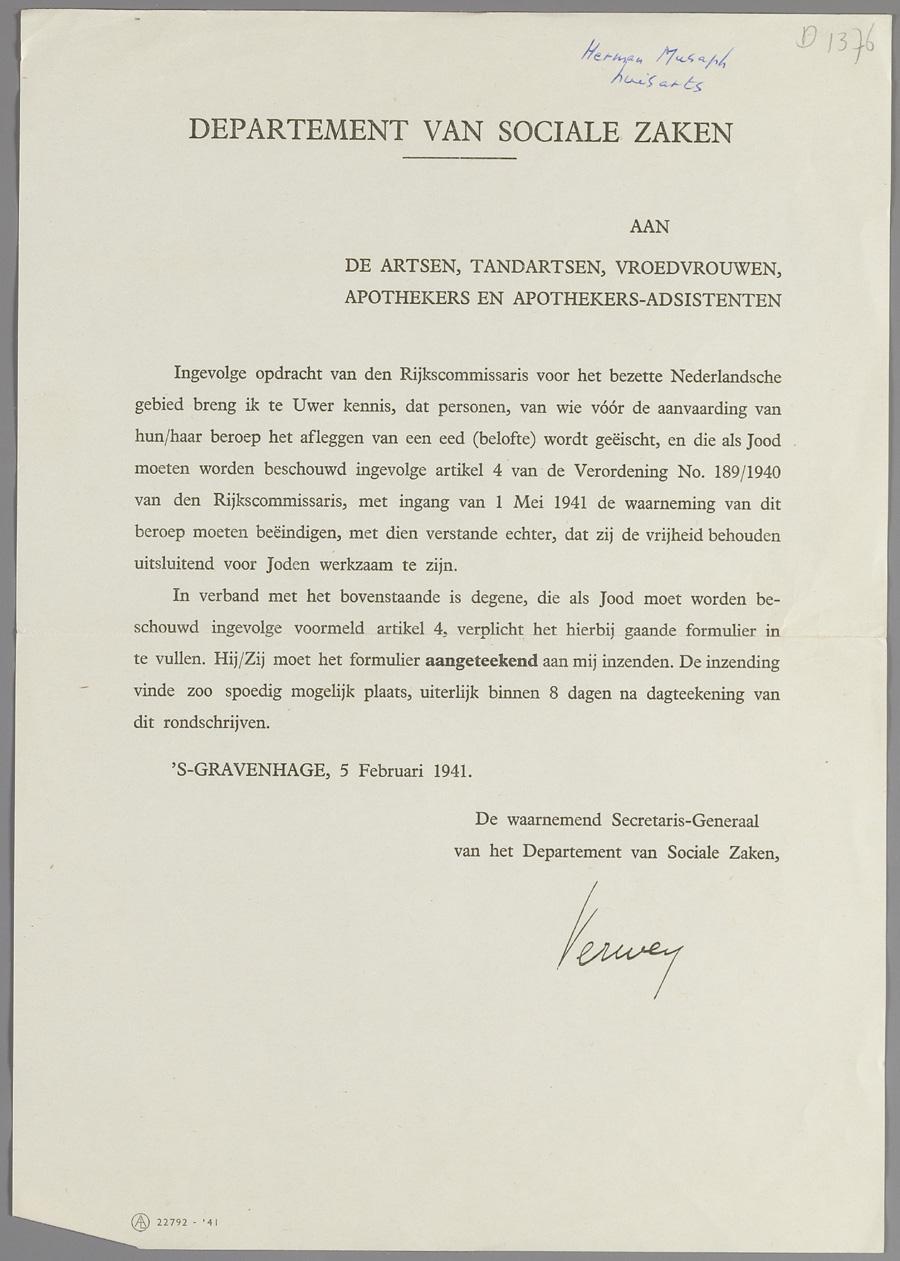 Circulaire van het Departement van Sociale Zaken dat joodse artsen alleen nog joodse patiënten mogen behandelen, februari 1941