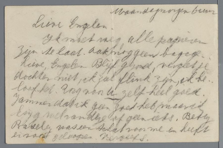 Afscheidsbriefkaart van dochter Vos aan haar ouders, de fam. Vos-de Bree in Amsterdam, 11 januari 1943