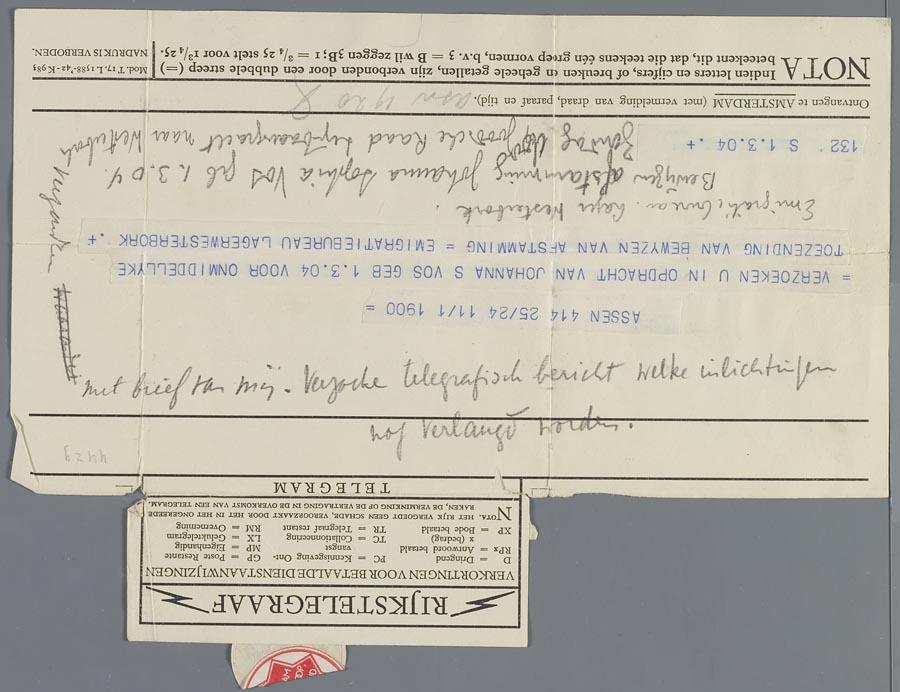 Telegram m.b.t. het toezenden van bewijzen om de afstamming van Johanna S. Vos-de Bree aan te tonen, 1943 (?)