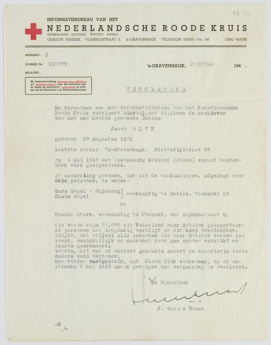 Verklaring, d.d. 1948, uitgegeven door het Rode Kruis, met betekking tot het overlijden van Jacob Blok in 1943 in Sobibor