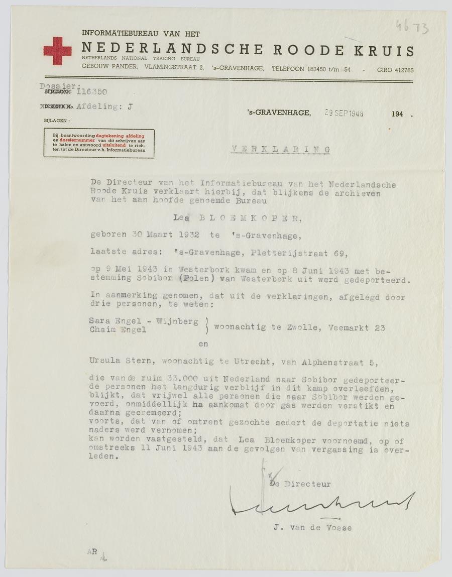 Verklaring m.b.t. het overlijden van Lea Bloemkoper te Sobibor (1943), 1948