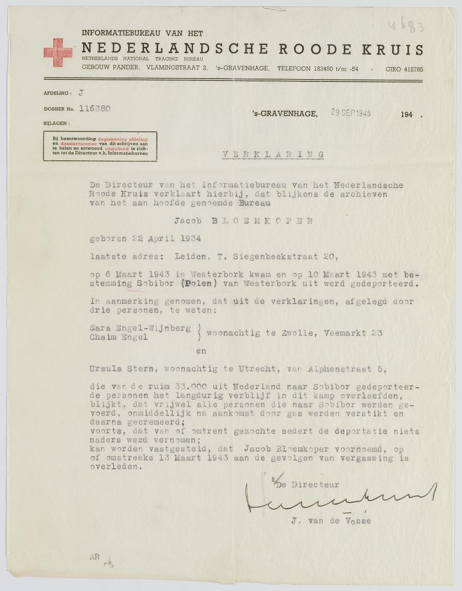 Verklaring m.b.t. het overlijden van Jacob Bloemkoper te Sobibor (1943), 1948