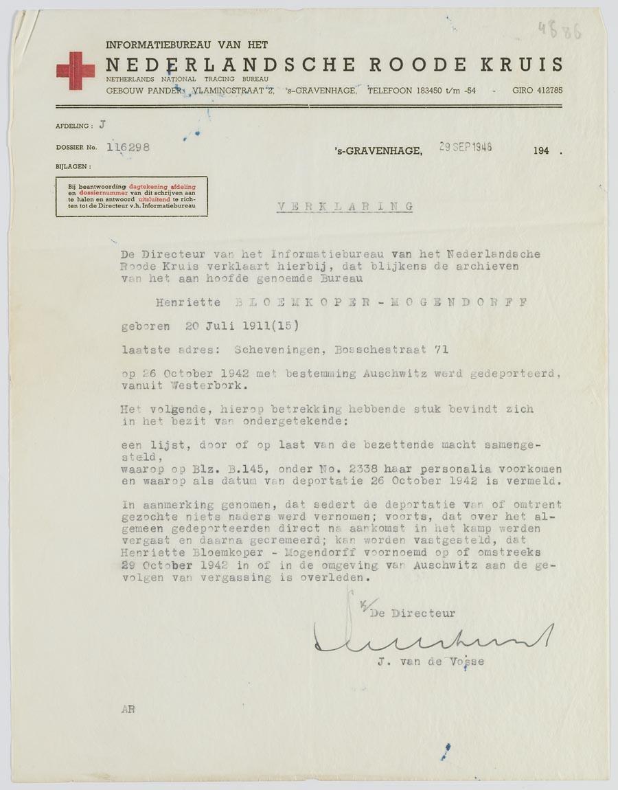 Verklaring m.b.t. het overlijden van Henriettte Bloemkoper- Mogendorff in Auschwitz (1942), 1948