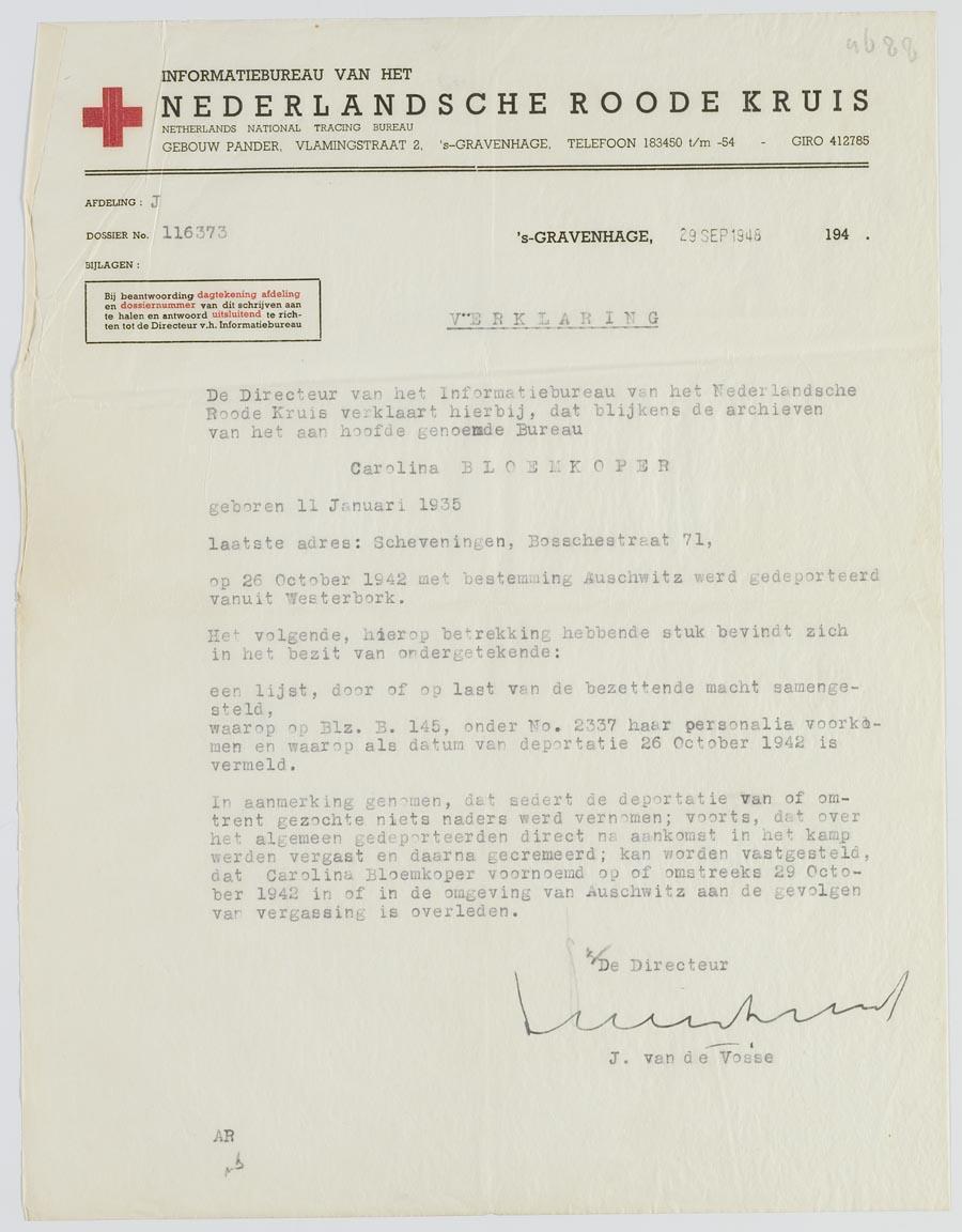 Verklaring m.b.t. het overlijden van Carolina Bloemkoper te Auschwitz (1942), 1948