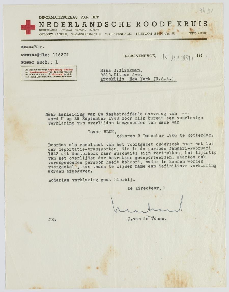 Brief m.b.t. overlijdensverklaring van Isaac Blok, 1951