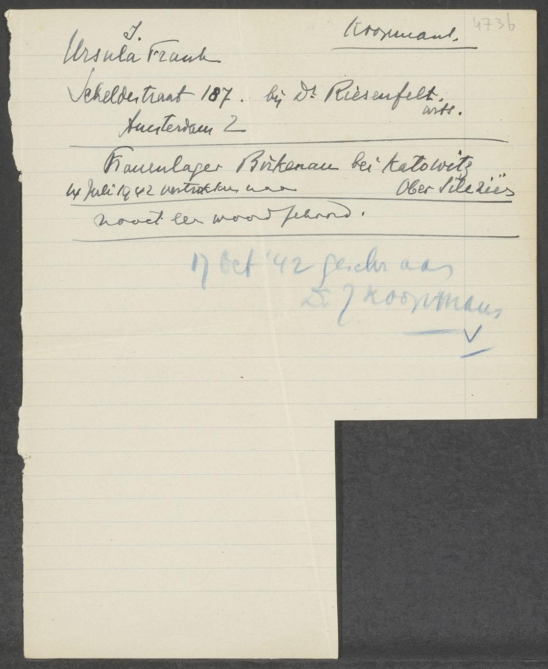 Kladblaadje met adressen van Ursula Frank in de oorlog, 1942