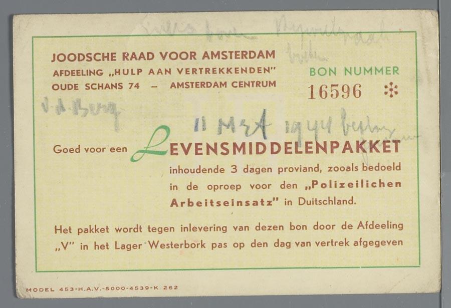 Bon voor een levensmiddelenpakket, in ontvangst te nemen bij vertrek uit Westerbork, 1944