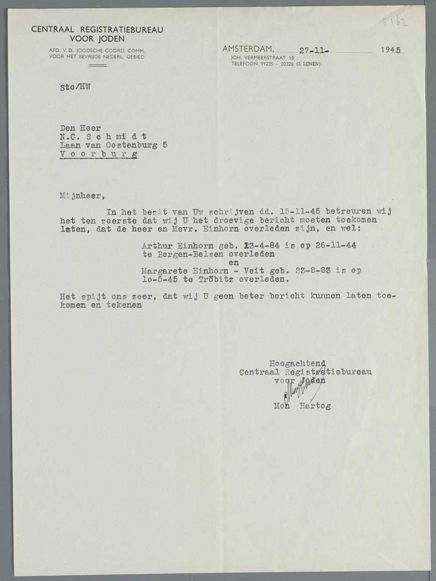 Brief aan N.C. Schmidt met overlijdensbericht van Arthur Einhorn en zijn vrouw Margarete, 1945