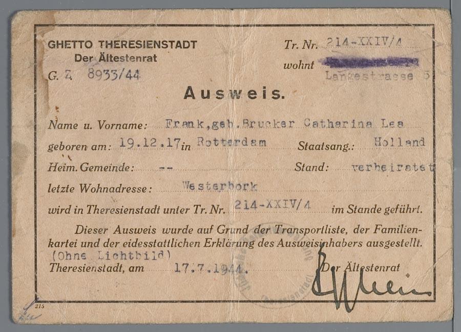 Legitimatiebewijzen (2) op naam van Catharina Frank-Brucker en haar zoon Clarence Frank, Theresienstadt, juli-augustus 1944