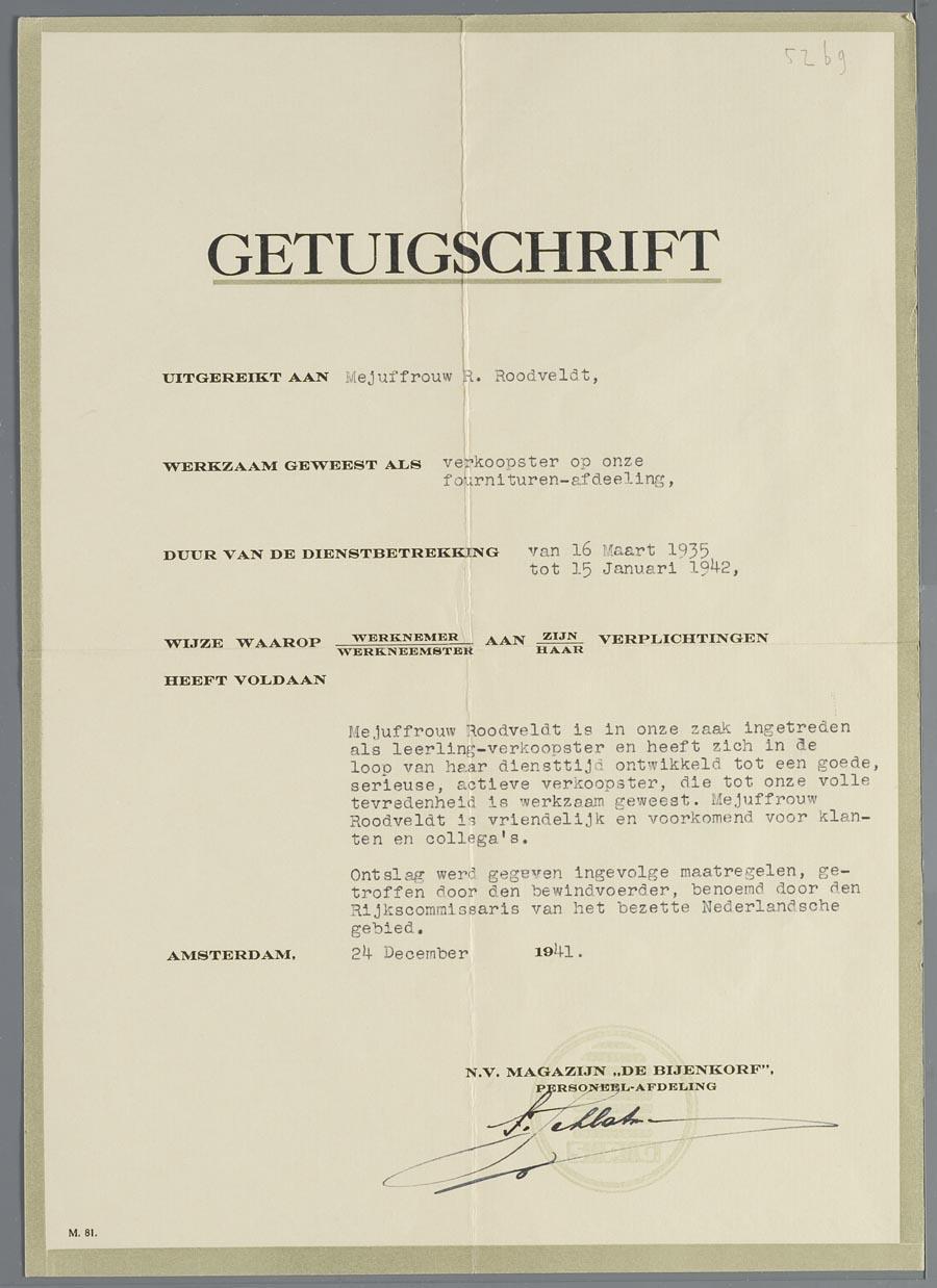 Getuigschrift, uitgereikt aan voormalige werkneemster van de Bijenkorf, Regina Roodveldt, 24 december 1941