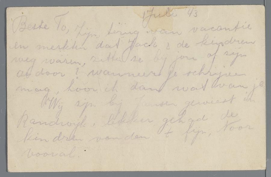 Briefkaart van Rie Roozemond in Amsterdam aan To (Kaatje - Cato) Peper-Boekman in Westerbork, juli 1943
